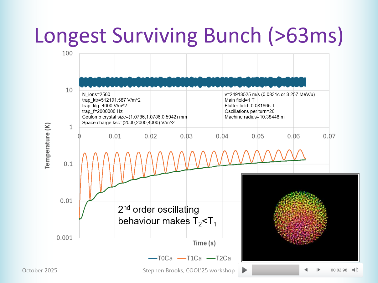 2025-Oct-29 18:14:36 Today I presented a talk at COOL'25 workshop, including these simulations of a ring that can store a three-dimensional Coulomb crystal for 1/16 of a second, or more than 24000 turns.   The crystal stays solid and bunched without cooling or RF.   #accelerators #physics  |